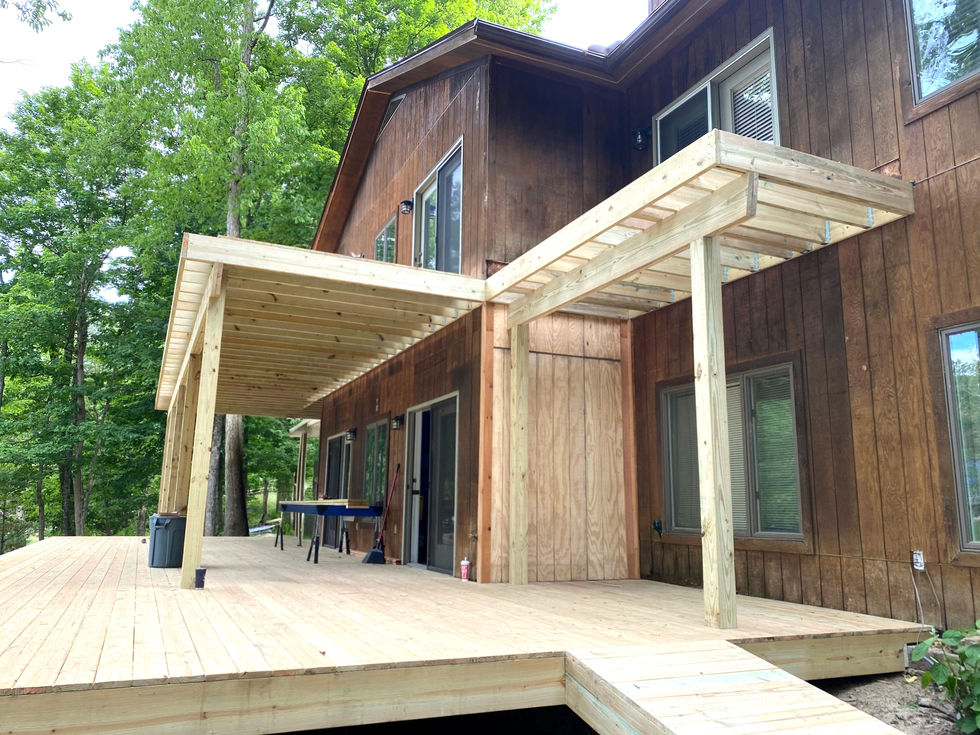 Exterior bridge walkway over koi pond at the main entry, T1-11 siding restoration, chimney/flashing/roofing work, Massive two level deck with various outcroppings overlooking lake Herrington, custom railing, & accessible ramp.